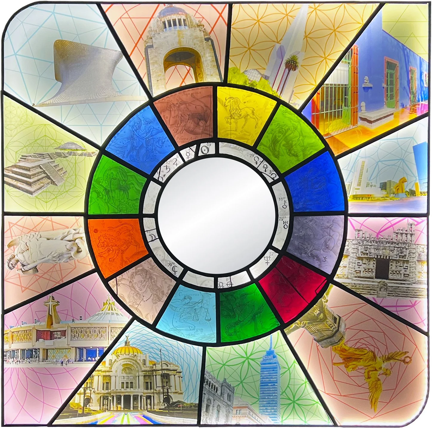Have you ever wondered how symbols influence you? Astrology, for instance, is full of symbols. It has been around for many millennia, soaking into our subconscious. I created this series of astrological charts of cities based on the year of their official designation, combined with local images and symbols. They are all on mirrors, so the viewers can see themselves immersed in the imagery, thus enabling them to connect to these destinations. (Personalized astrology charts may be commissioned).